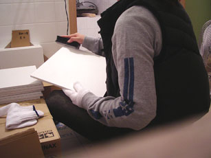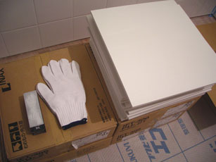 きちんと並べられたタイル、削る道具、新品の軍手、が用意してあった。